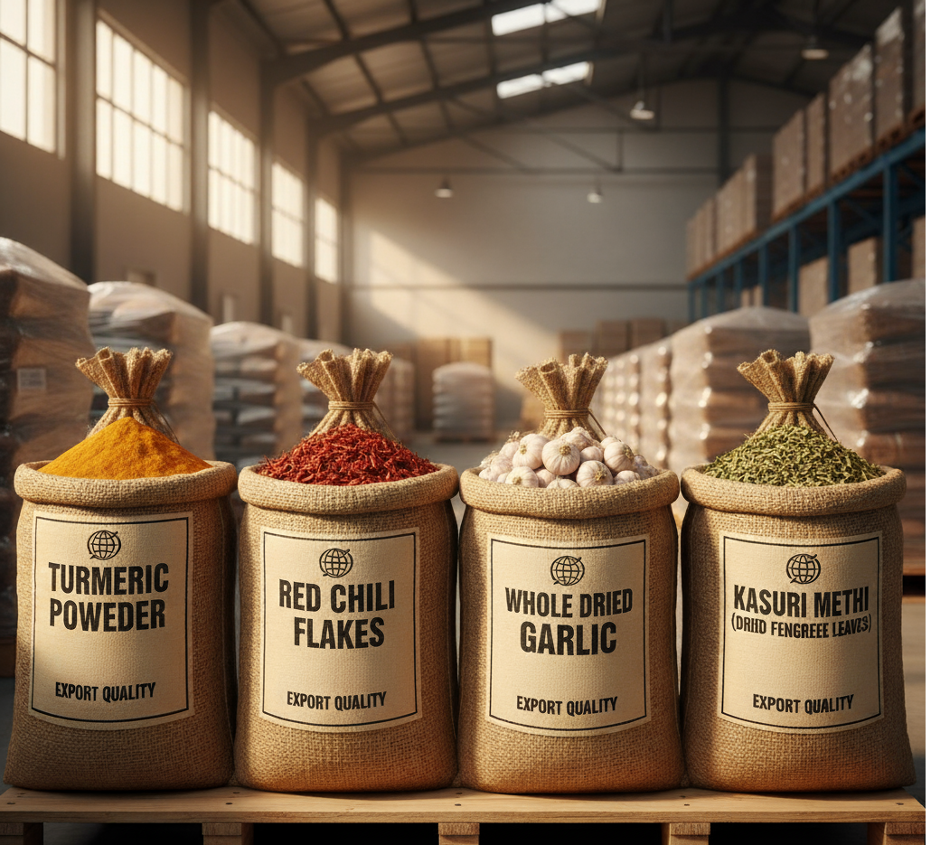 We supply a wide range of raw and processed spices including turmeric, garlic, kasuri methi, red chili, coriander, and cumin.